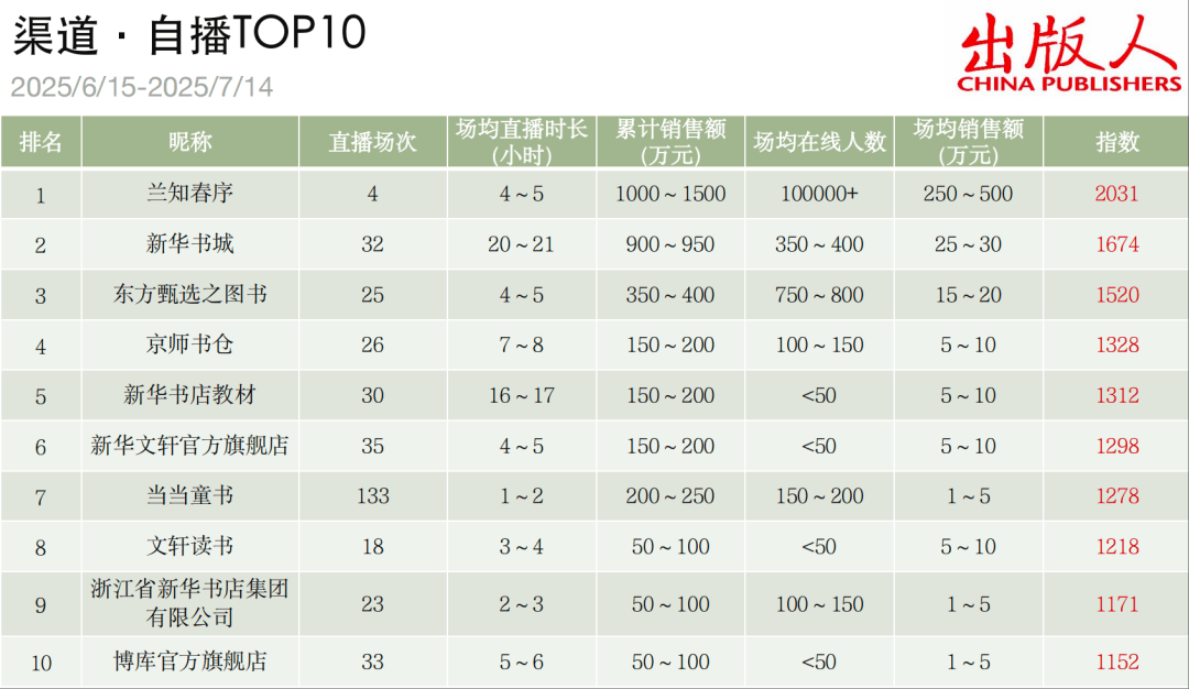 新华书城”和“东方甄选之图书”。“兰知春序”为董宇辉团队开设的新账号,主要运营方向为影视、文学、文旅。其在统计周期内直播4场,场均直播4~5小时,场均销售额在250万元~500万元,本期带货人民美术出版社出版的“四大名著”系列连环画,在首场直播中成为销量冠军。“新华书城”本期直播32场,场均直播20~21小时,累计销售额近千万元,直播间产品以教材教辅为主。“东方甄选之图书”本期排名第三,在统计周期内直播25场,场均直播4~5小时,累计销售额近400万元,《花生·琼斯》(精装硬壳3册)、斗半匠2025新版1~6年级《快乐读书吧》为其直播间畅销产品。本期渠道10强账号变动较大,“