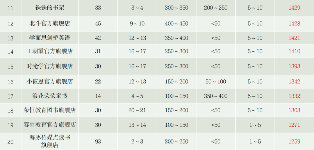 强中,月累计销售额最高的为“一本图书官方旗舰店初中”,累计销售额超3500万元;除此之外,超1000万元的还有“万唯中考官方旗舰店”“宝宝巴士官方旗舰店”“一本官方旗舰店”,除“宝宝巴士官方旗舰店”外均为教辅公司。本期入榜的教辅公司共计14个。暑期来临,头部教辅图书公司加大流量投入,销售额较上期呈指数增长。本期新增账号“宝宝巴士官方旗舰店”“小彼恩官方旗舰店”均以售卖阅读点读产品为主,与“海豚传媒点读书旗舰店”的产品类型相近。从场均在线人数来看,“
